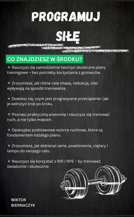 „Programuj Siłę” to kompletny e-book i jednocześnie gotowe narzędzie, które nauczy Cię od podstaw, jak samodzielnie i świadomie rozpisywać skuteczne plany treningowe. To nie jest zbiór przypadkowych porad – to podręcznik w prawdziwym tego słowa znaczeniu, stworzony tak, aby prowadzić Cię krok po kroku niczym szkolny materiał, ale w temacie, który realnie zmienia Twoje życie. Cała wiedza jest w nim podana w przystępny, uporządkowany sposób, tak abyś mógł od razu zastosować ją w praktyce.